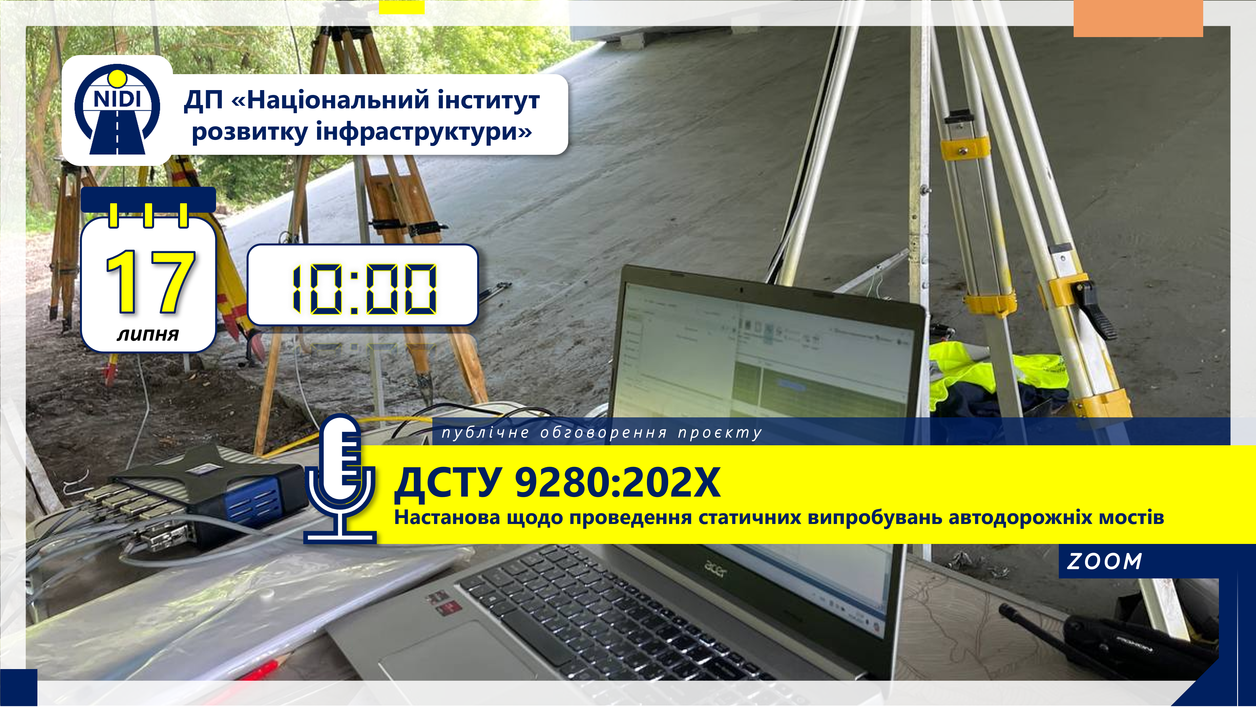Запрошуємо всіх зацікавлених фахівців 17 липня 2024 року, о 10:00 на публічне обговорення проєкту ДСТУ 9280:202Х «Настанова щодо проведення статичних випробувань автодорожніх мостів».