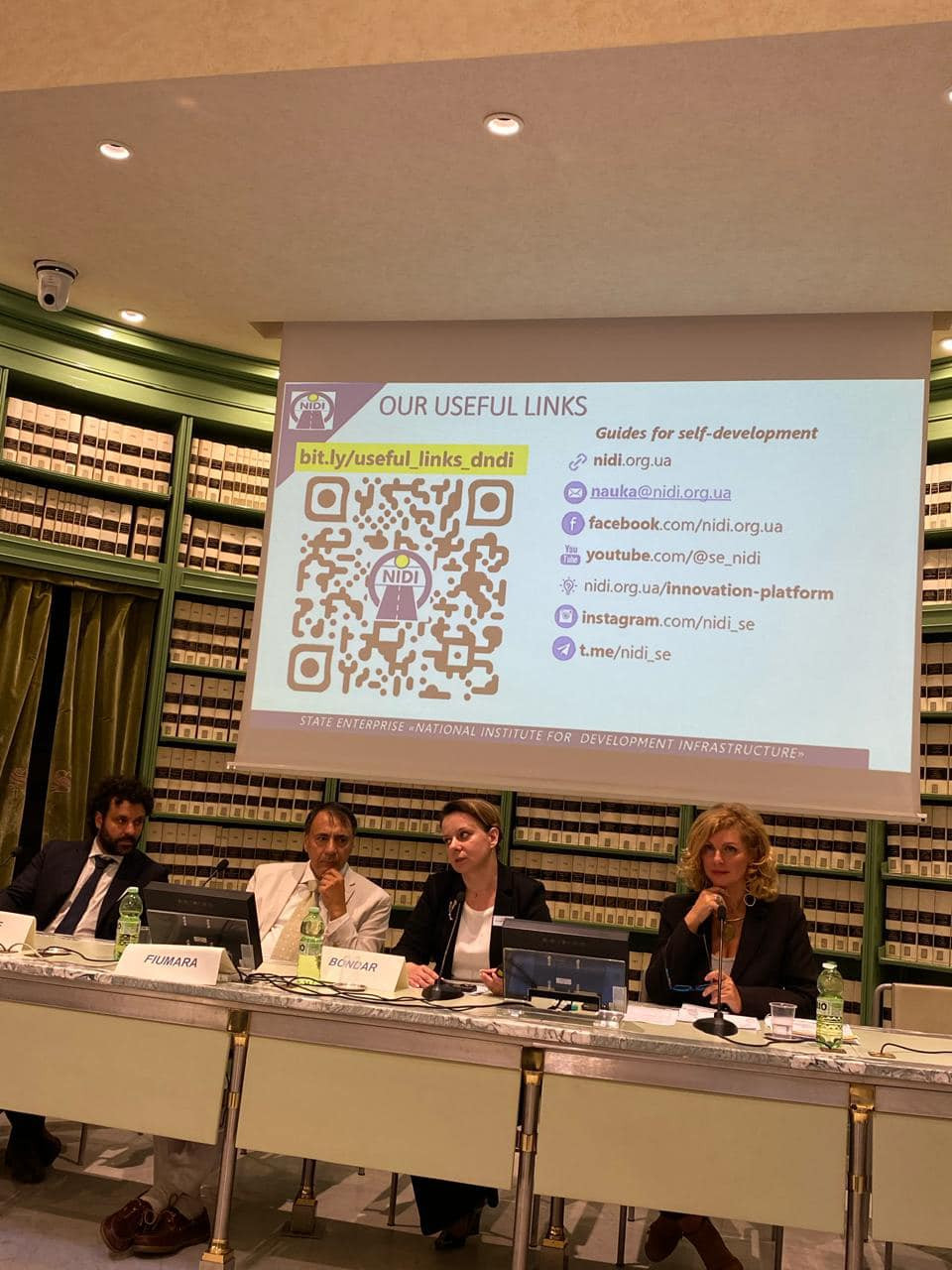 14 жовтня 2024 року команда ДП «Національний інститут розвитку інфраструктури» взяла участь у міжнародній конференції в Сенаті Італії «На шляху до відбудови України» на запрошення сенаторки Італії Чінції Пеллегріно.