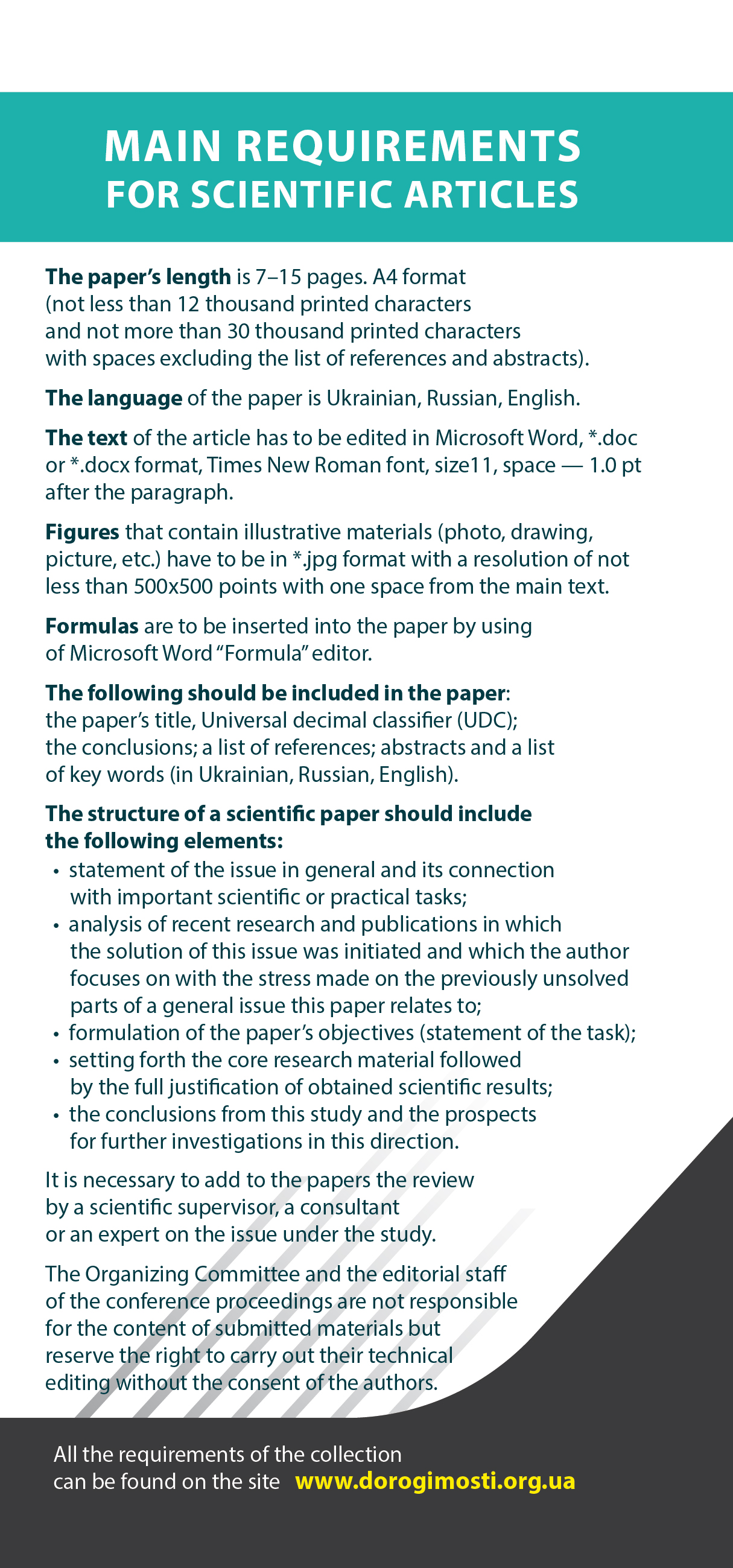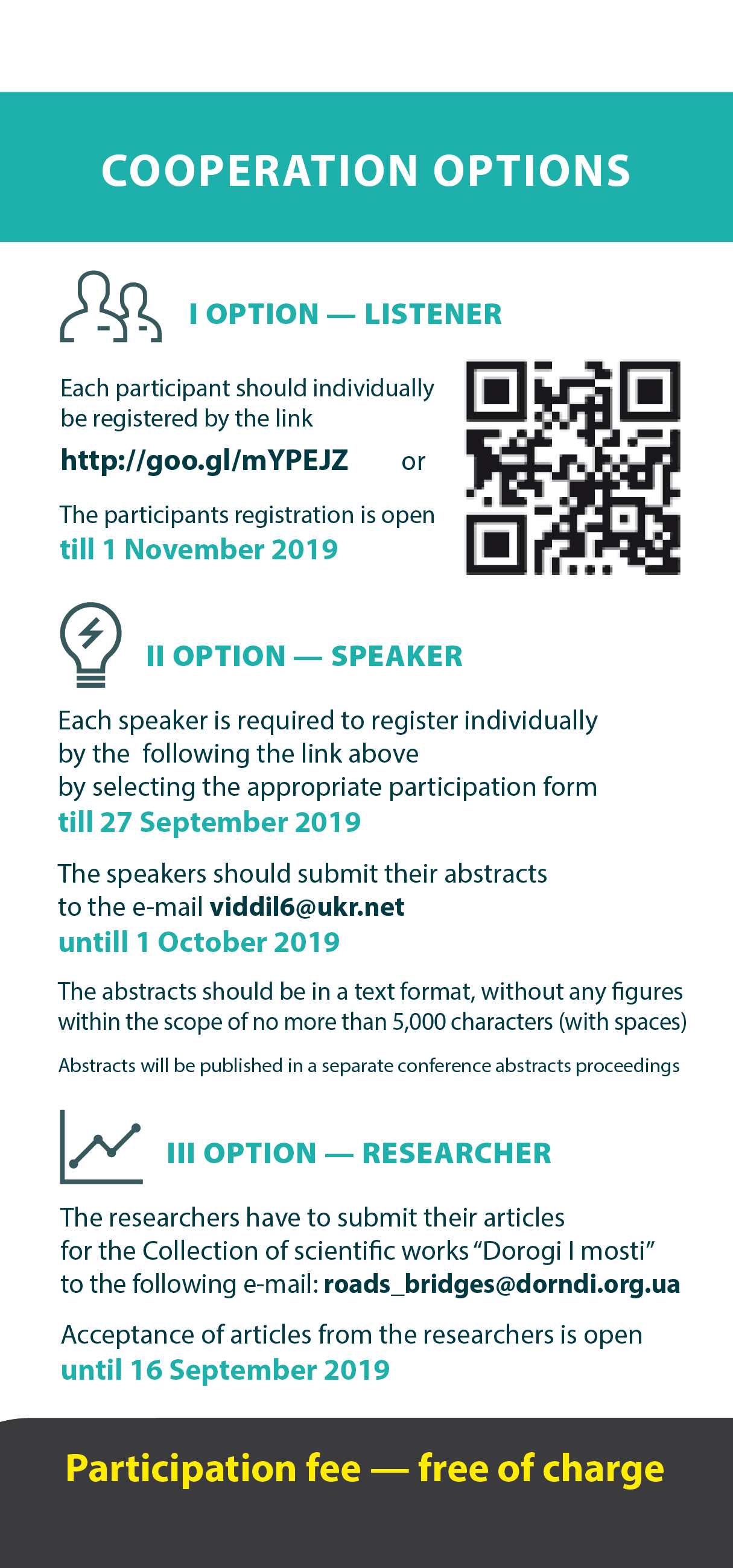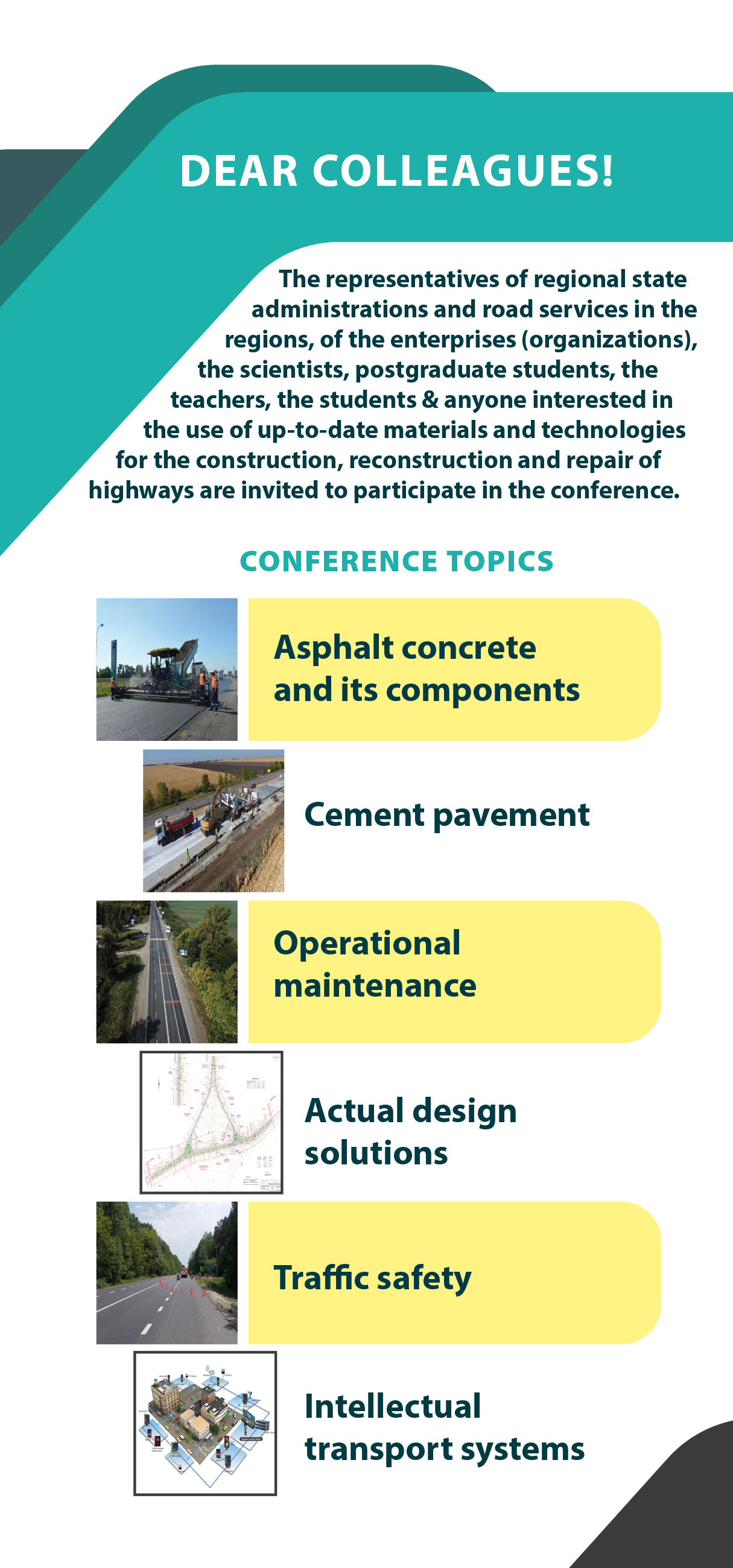 The representatives of regional state administrations and road services in the regions, of the enterprises (organizations), the scientists, postgraduate students, the teachers, the students and anyone interested in the use of up-to-date materials and technologies for the construction, reconstruction and repair of highways are invited to participate in the conference.