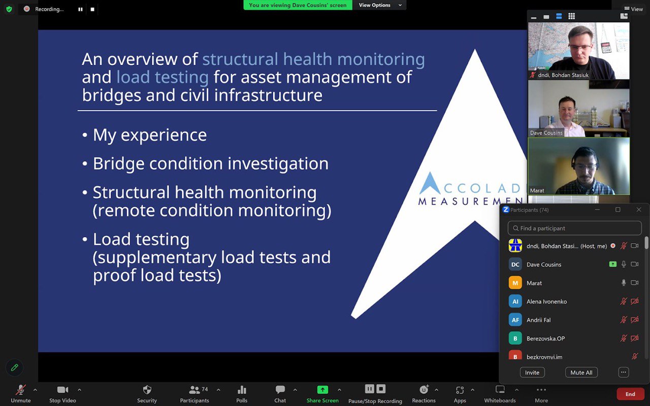 Особливістю заходу стало те, що Дейв Казінс не тільки поділився своїм колосальним досвідом щодо обстеження мостів, а і протягом години відповідав на численні питання наших фахівців. Таким чином ми отримали випуск, який варто переглянути всім спеціалістам, які займаються питаннями мостів.