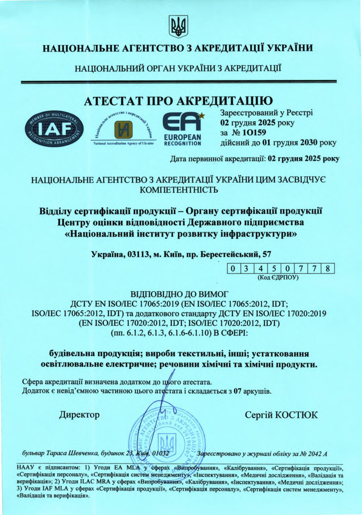 Орган сертифікації продукції ДП "Національний інститут розвитку інфраструктури" пройшов акредитацію в Національному агентстві з акредитації України, який засвідчив його компетентність у сфері будівельної продукції, виробів текстильних, устатковання освітлювального електричного, речовин хімічних та хімічних продуктів.
