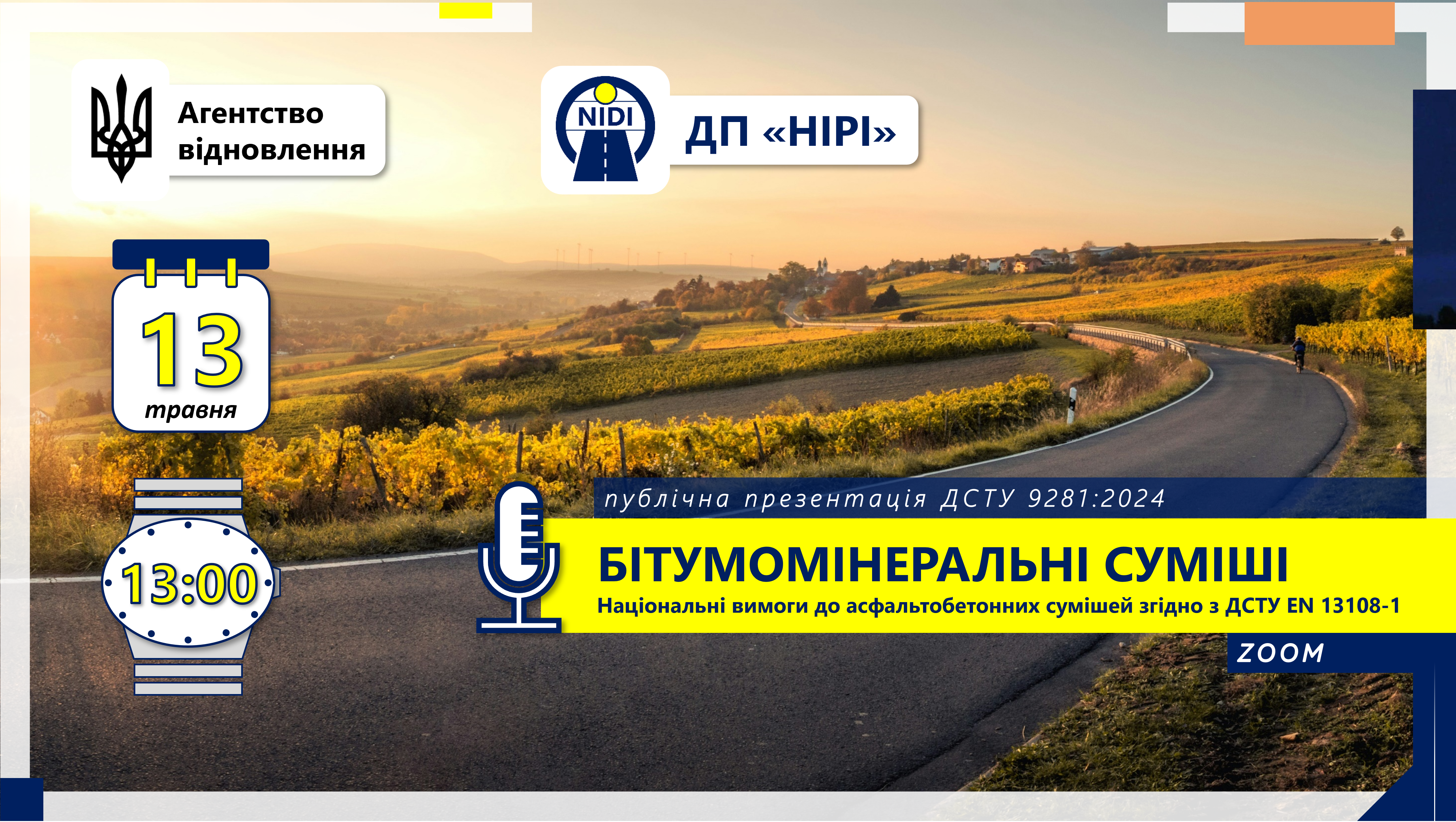 Запрошуємо всіх зацікавлених фахівців на публічну презентацію основних вимог ДСТУ 9281:2024 «Бітумомінеральні суміші. Національні вимоги до асфальтобетонних сумішей згідно з ДСТУ EN 13108-1».