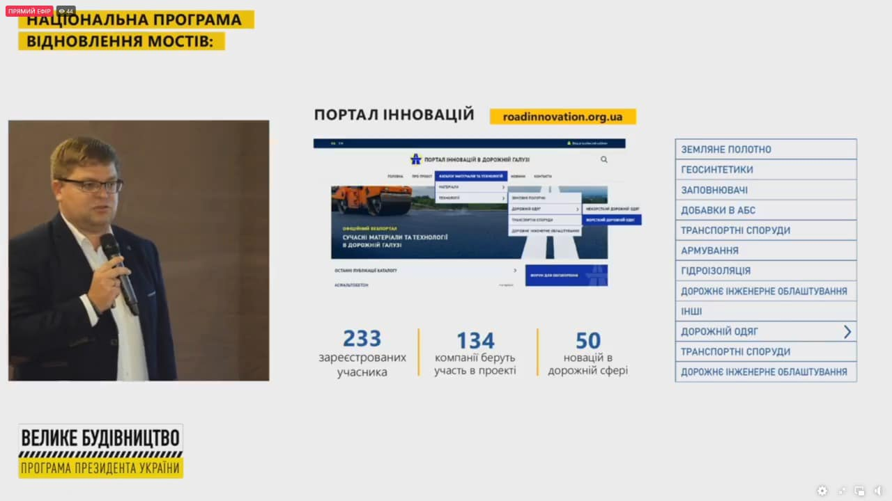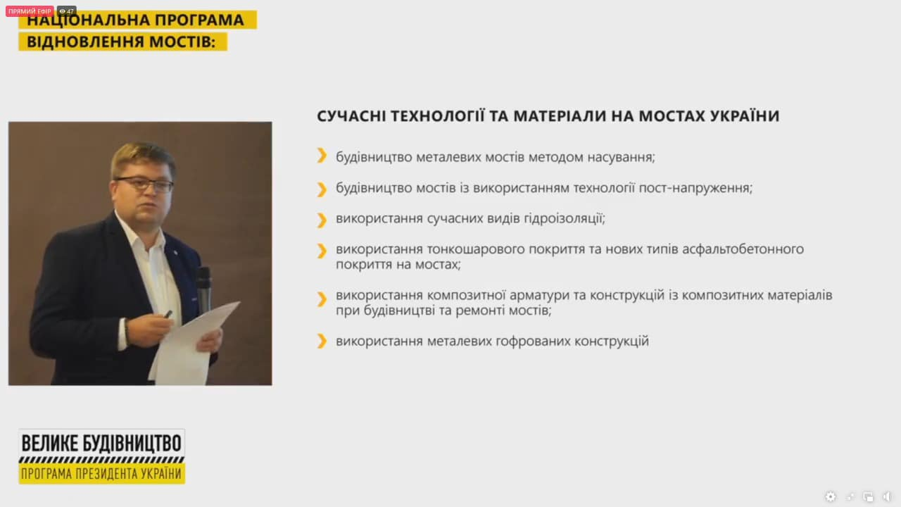 21 вересня 2021 року директор ДП "ДерждорНДІ" взяв участь у презентації результатів роботи Національної програми відновлення мостів за 16 місяців.