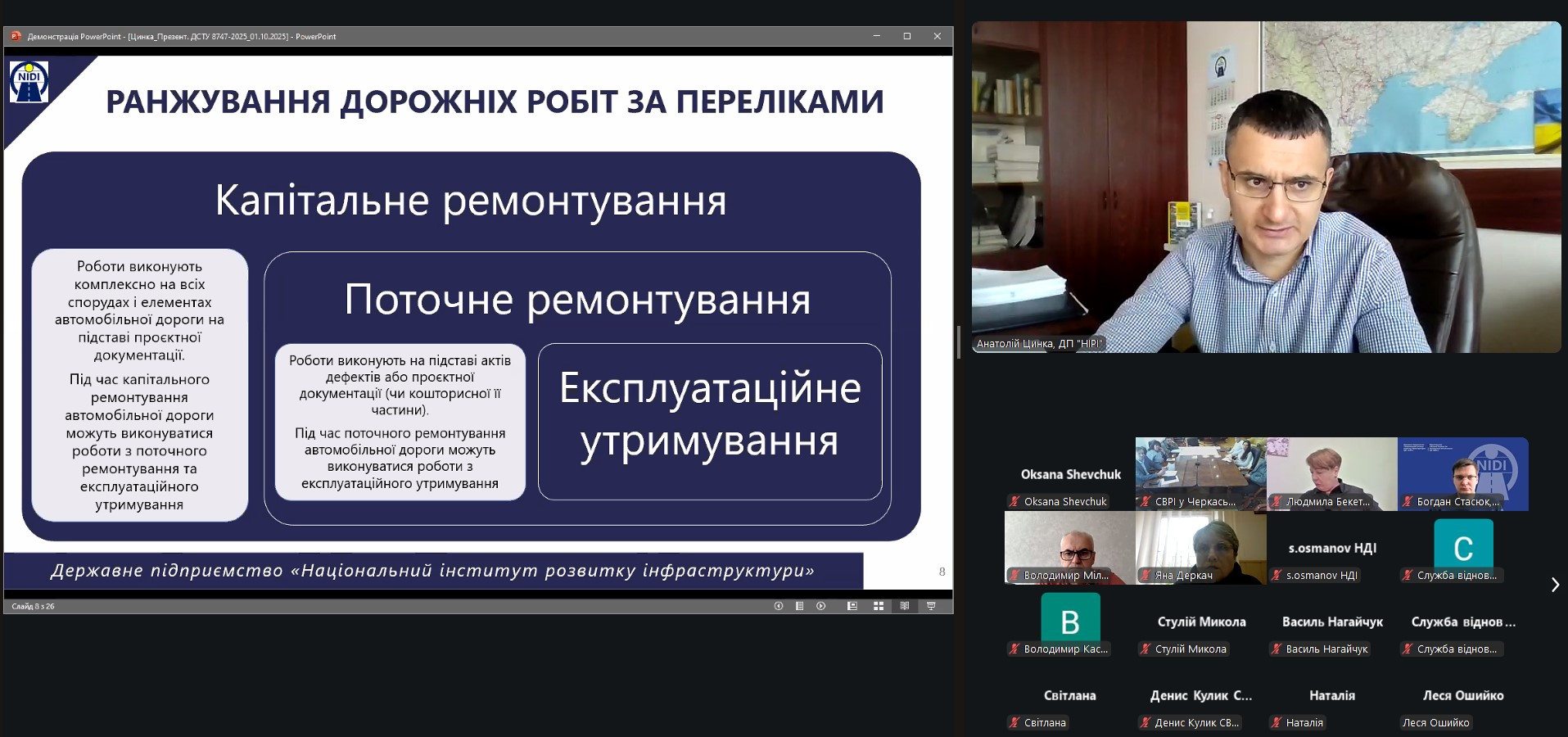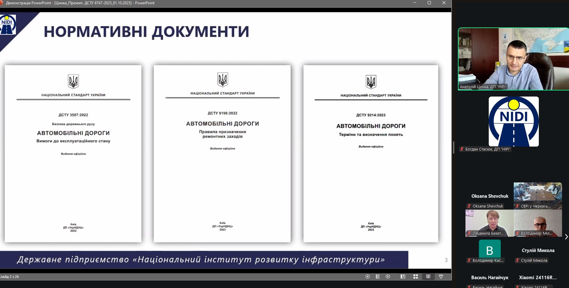 1 жовтня 2025 року, набуває чинності ДСТУ 8747:2025 «Автомобільні дороги загального користування. Види та переліки робіт з ремонтувань та експлуатаційного утримування», розроблений колективом ДП «НІРІ». З цієї нагоди ми організували публічну презентацію оновленого стандарту.