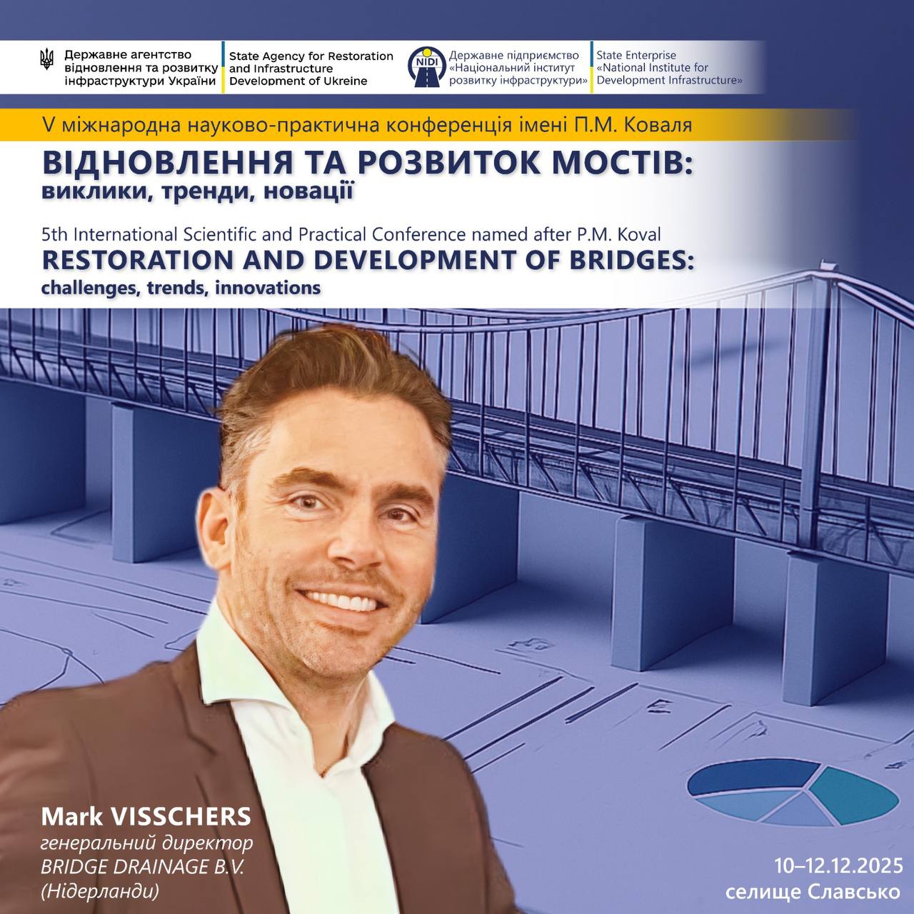 Один із ключових спікерів — Марк Вішерс, генеральний директор компанії Брідж Дренаж (Mark Visschers, CEO of BRIDGE DRAINAGE B.V.) — висвітлить питання модернізації систем водовідведення шляхом застосування бордюрних лотків в зонах високих навантажень на мостах та автомобільних дорогах.