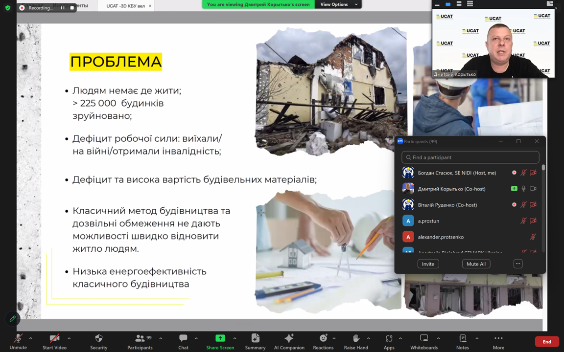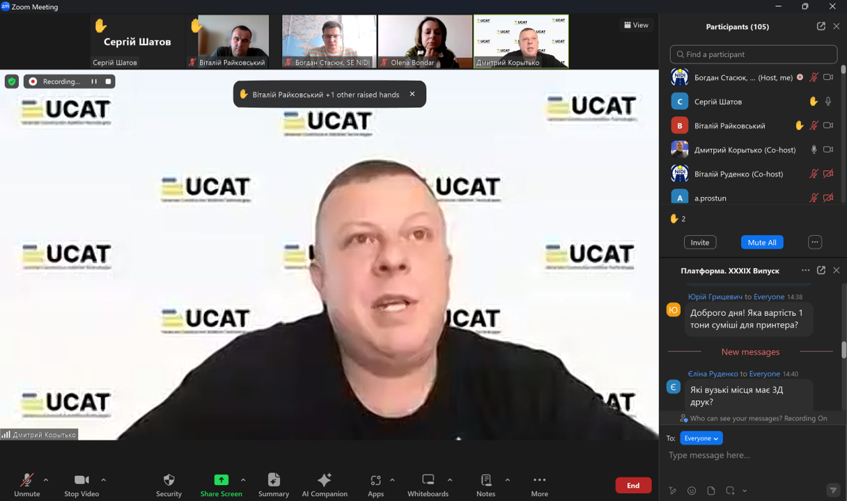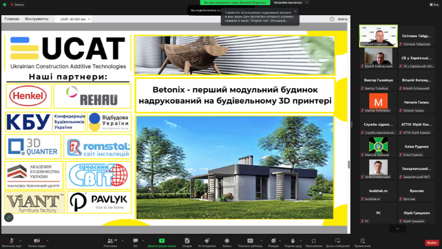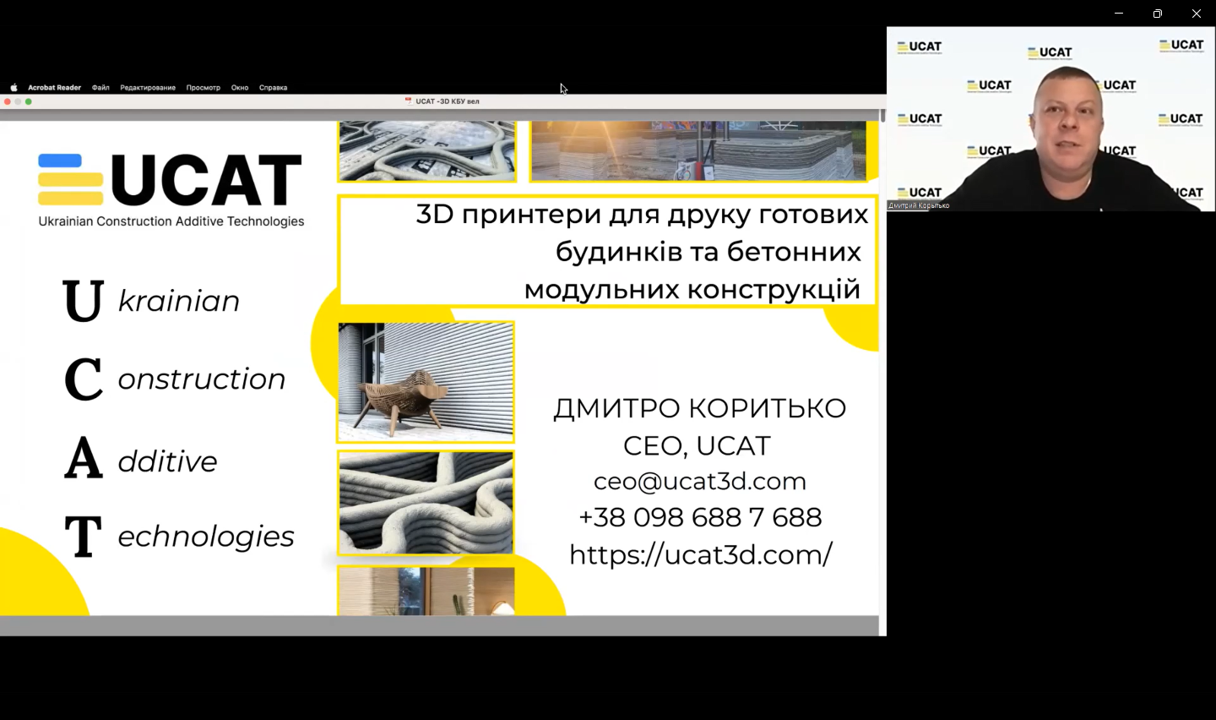Команда ДП «Національний інститут розвитку інфраструктури» провела XXXVIIІ випуск Платформи інновацій, на якому в експертному колі більше ніж 100 фахівців, а саме балансоутримувачів, проектувальників, замовників та інших компаній розглянули можливості сучасної технології 3D друку будівель і споруд з бетону, що були представлені ТОВ "ЮКАТ-3Д”.