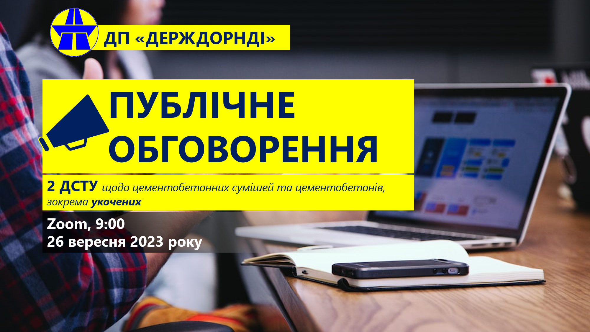Шановні колеги, запрошуємо 26 вересня 2023 року всіх зацікавлених фахівців на публічне обговорення проєктів 2 національних стандартів, що розроблені ДП "ДерждорНДІ": ДСТУ 8858:202Х «Суміші цементобетонні дорожні та цементобетон дорожній. Технічні умови» та ДСТУ ХХХХ:202Х «Суміші цементобетонні укочувані та цементобетон укочений. Технічні умови».