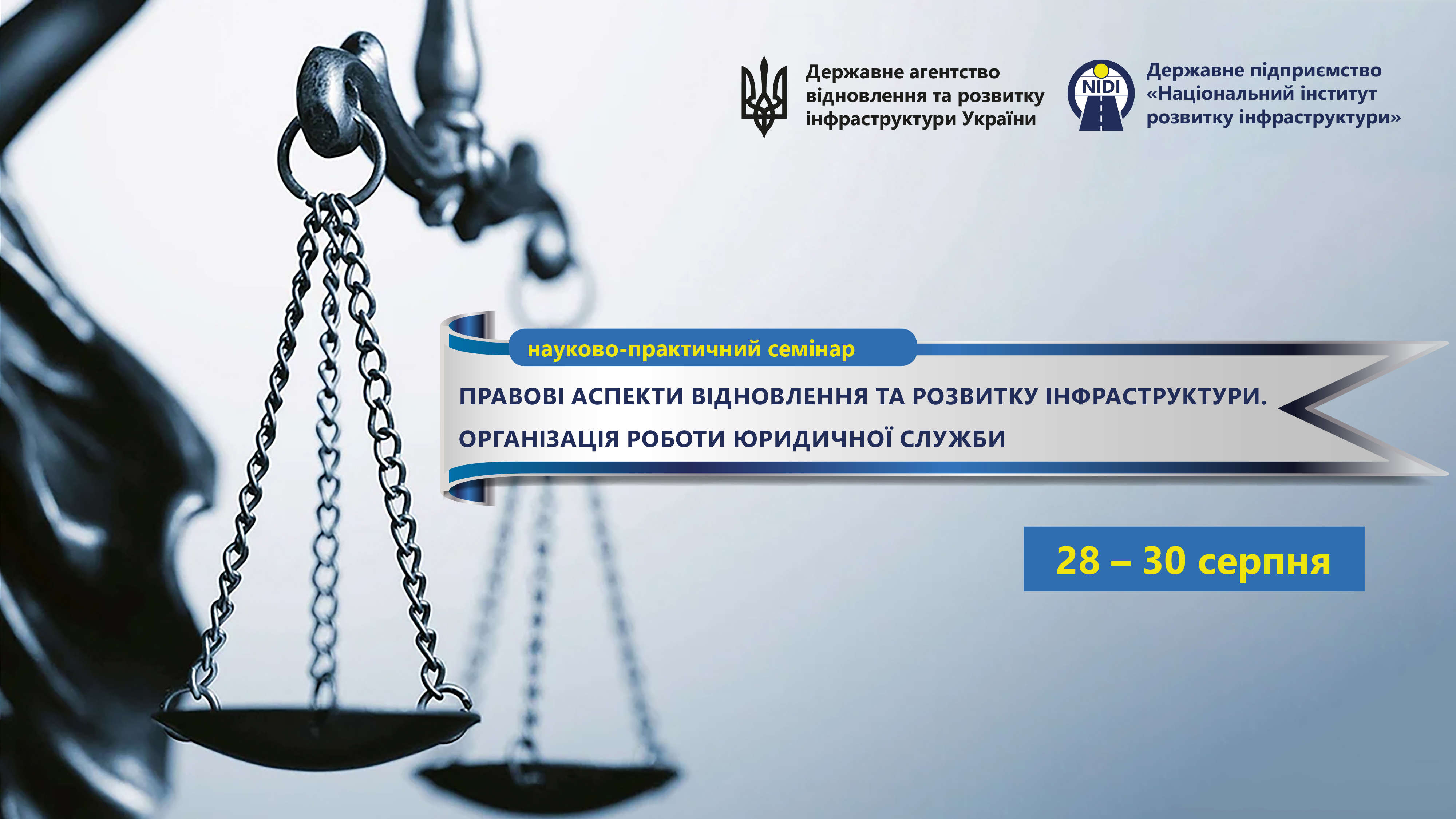 Державне агентство відновлення та розвитку інфраструктури України спільно з державним підприємством «Національний інститут розвитку інфраструктури» запрошує керівників підприємств, установ та організацій і всіх їх зацікавлених фахівців взяти участь в науково-практичному семінарі на тему «Правові аспекти відновлення та розвитку інфраструктури. Організація роботи юридичної служби» (далі – Семінар), який відбудеться 28 – 30 серпня 2024 року, в м. Чернівці (з міркувань безпеки точне місце проведення Семінару буде повідомлено лише зареєстрованим учасникам).