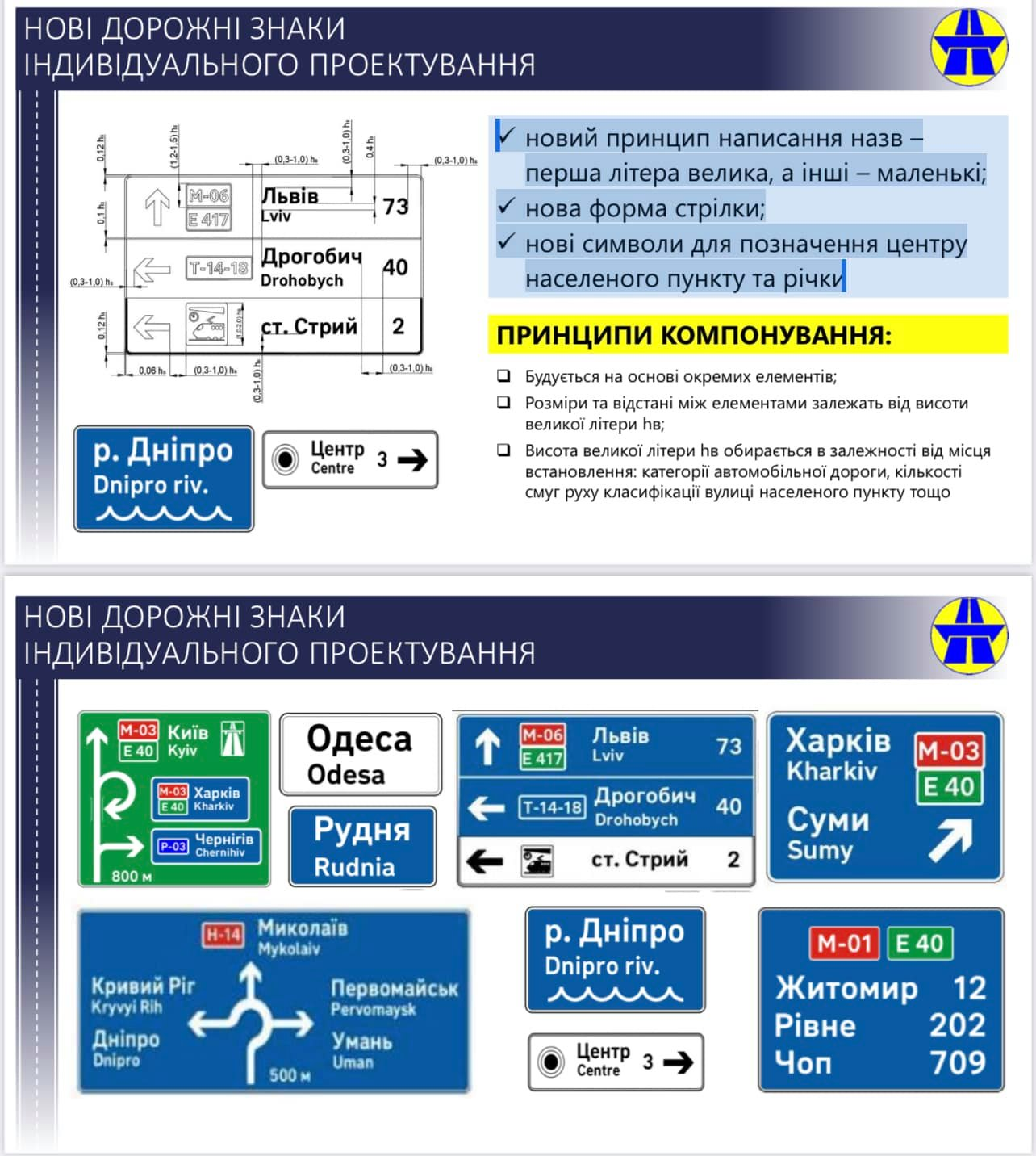 Стандарт вносить нові принципи для компонування дорожніх знаків індивідуального проектування (наприклад, новий принцип написання назв населених пунктів: перша літера велика, а інші – маленькі); передбачає нові знаки і таблички до дорожніх знаків для розвитку велоінфраструктури; запроваджує новий алгоритм розміщення знаків на щитах та фонових щитах.