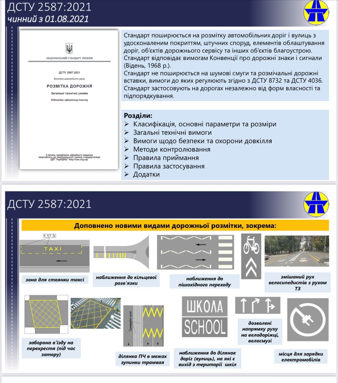 Стандарт доповнює дорожню розмітку щодо зони для стоянки таксі та зарядки електромобілів, наближення до кільцевої розв’язки та пішохідного переходу (особливо біля шкіл), заборони в’їзду на перехрестя під час затору, посадкової ділянки в межах зупинки трамвая тощо.