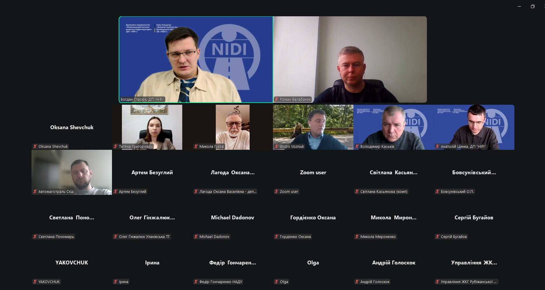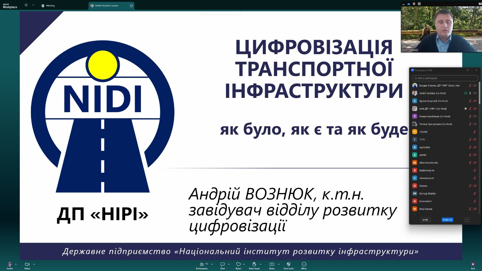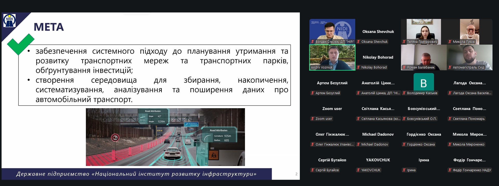 31 березня 2026 року команда ДП "Національний інститут розвитку інфраструктури" за підтримки ГО «ГІС-Кадастрова асоціація України» провела вебінар «Цифровізація управління автомобільними дорогами: прості інструменти для щоденної роботи», який зібрав понад 100 учасників з усієї України: це балансоутримувачі автомобільних доріг загального користування державного та місцевого значення, науковці, проєктувальники, підрядники, профільні асоціації та небайдужа громадськість.
