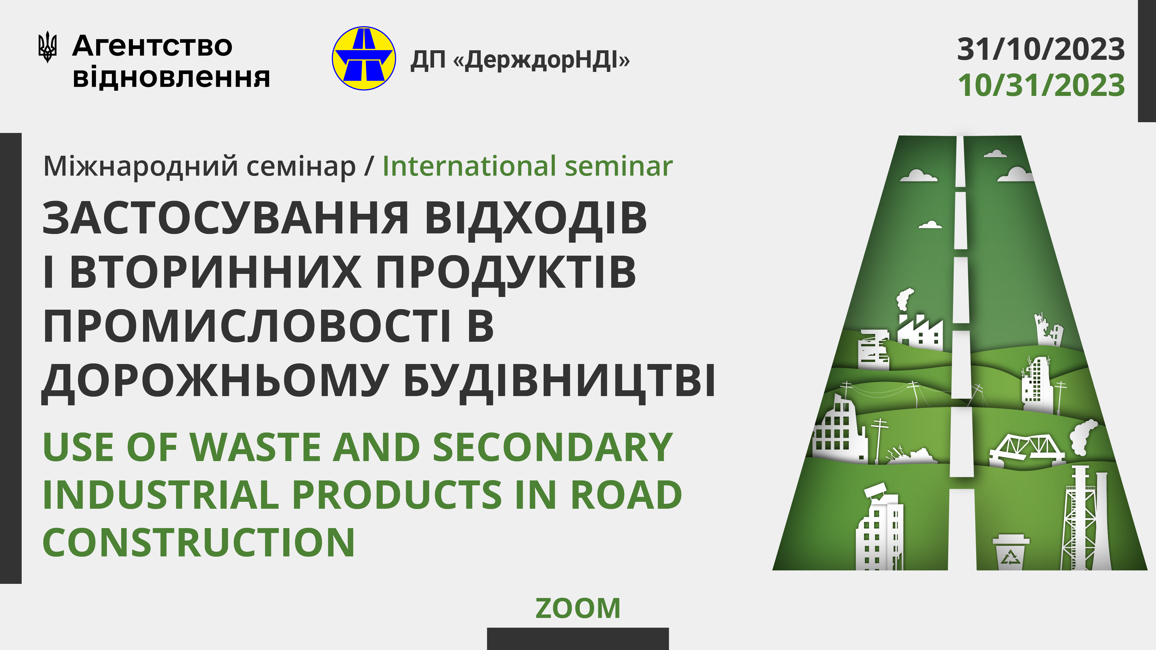 Державне агентство відновлення та розвитку інфраструктури України спільно з ДП «ДерждорНДІ» запрошує всіх зацікавлених на міжнародний науково-практичний семінар «Застосування відходів і вторинних продуктів промисловості в дорожньому будівництві» за участю провідних світових експертів, який відбудеться 31.10.2023 в онлайн режимі!